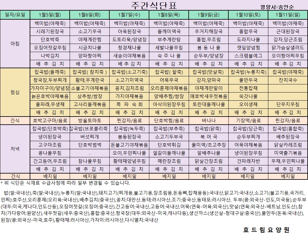 식단표 01/05 ~ 01/11[식단표] 작성자 Admin 작성일 2026-01-06 16:39 조회 39 좋아요 1 싫어요 0 인쇄 « 12/15 ~ 12/21[식단표] 01/12 ~ 01/18[식단표] » 목록보기 답글쓰기 Powered by KBoard
